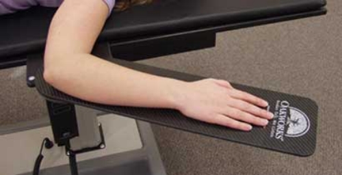 The OAKWORKS® Carbon fiber arm board is fully radiolucent with a 180° range of motion. The arm board requires no mounting or attachment hardware and simply slides under the table top pad. This product can be used on any fluoroscopy table ad can support arms and feet in a variety of positioning configurations. This unique design allows the product to be folded together for safe and compact storage when not in use.